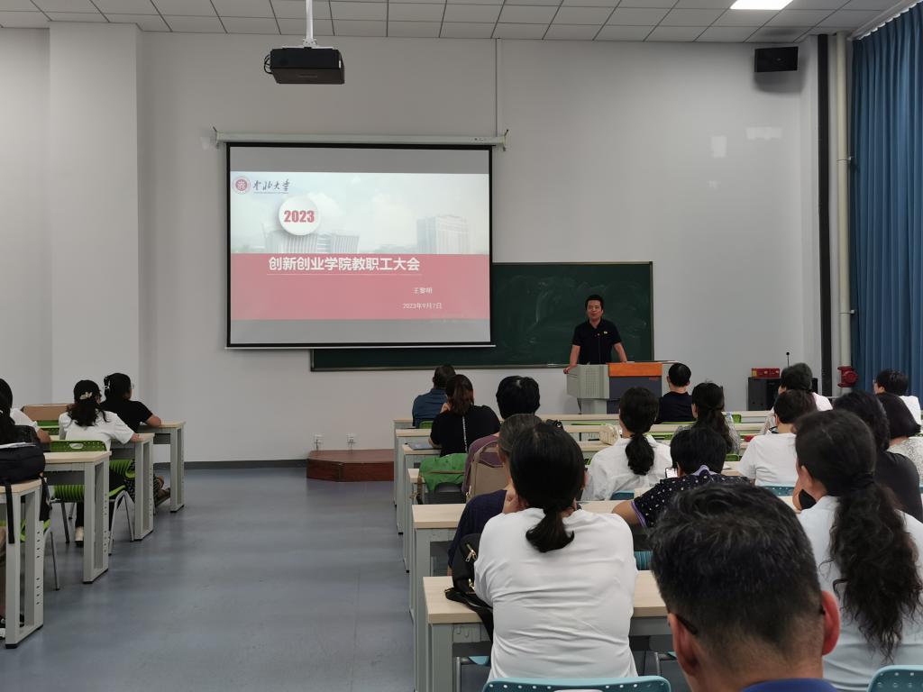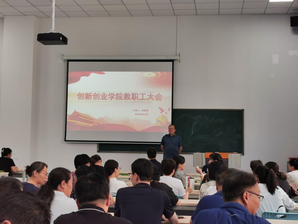 高春强书记首先传达了学校2023年秋季学期工作部署会会议精神,宣布了学院基层组织的设置及人员配备情况,对学院开展的党建工作进行总结并提出了新学期工作计划。会上,高春强书记对每位教职工提出如下要求:一是提高政治站位,树立危机意识,拒绝躺平,时刻以饱满激情投入教育教学工作;二是围绕“深耕创新能力,厚植创业意识”这个定位开展学院的各项工作;三是每位教师要秉承德高为师,身正为范的理念,潜心教书育人,多做教育教学研究;四是要求全院教职员工要团结一致、凝心聚力,为学院发展谱新篇。