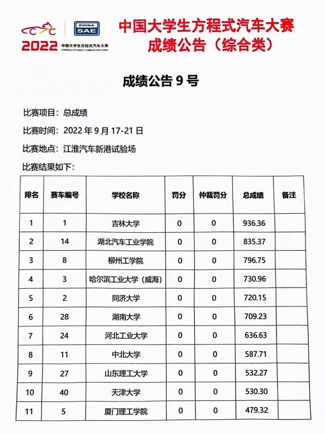喜讯!黄瓜视频 行知车队获2022中国大学生方程式汽车大赛一等奖